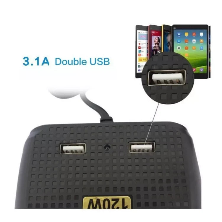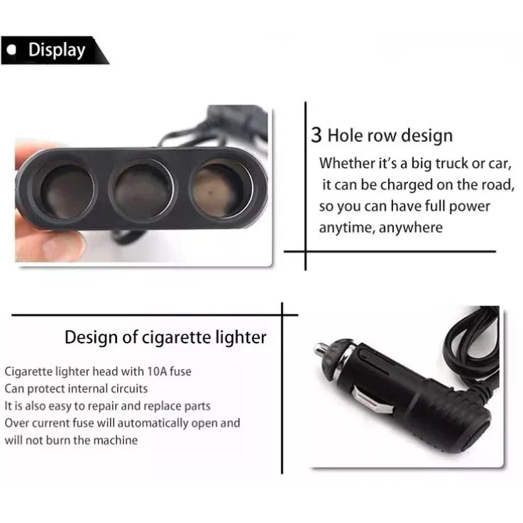 Enchufes de Alta Capacidad: Los 3 conectores de encendedor de cigarrillos proporcionan una potencia sólida de hasta 120W, perfectos para mini neveras, reproductores de DVD, aspiradoras portátiles, GPS y más.
