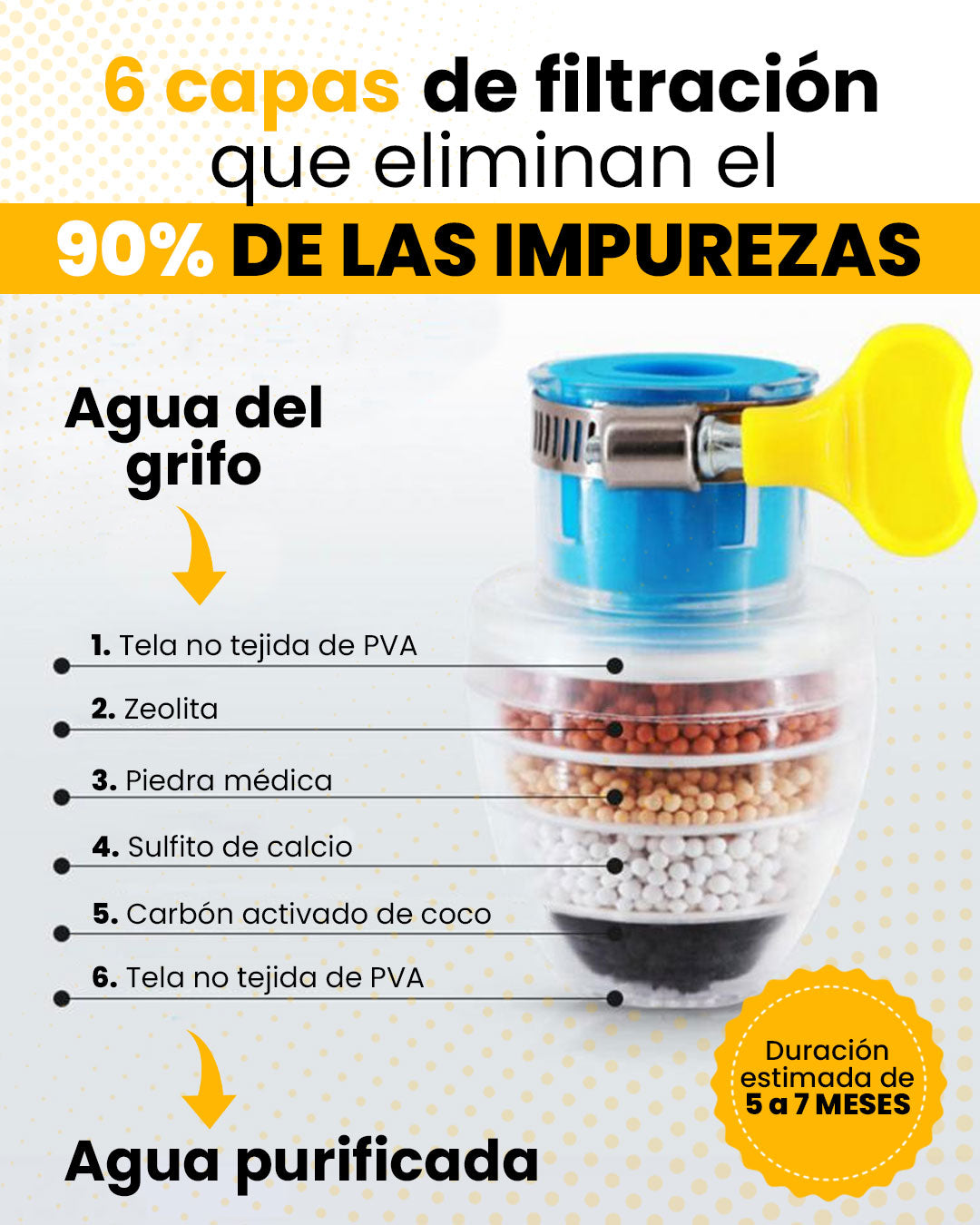 Nuestro filtro de agua para grifo transforma el agua dura y de pozo en agua más limpia y saludable. Gracias a su filtro de 5 capas, elimina impurezas como metales pesados, cloro y otras toxinas, mejorando la calidad del agua que consumes diariamente.