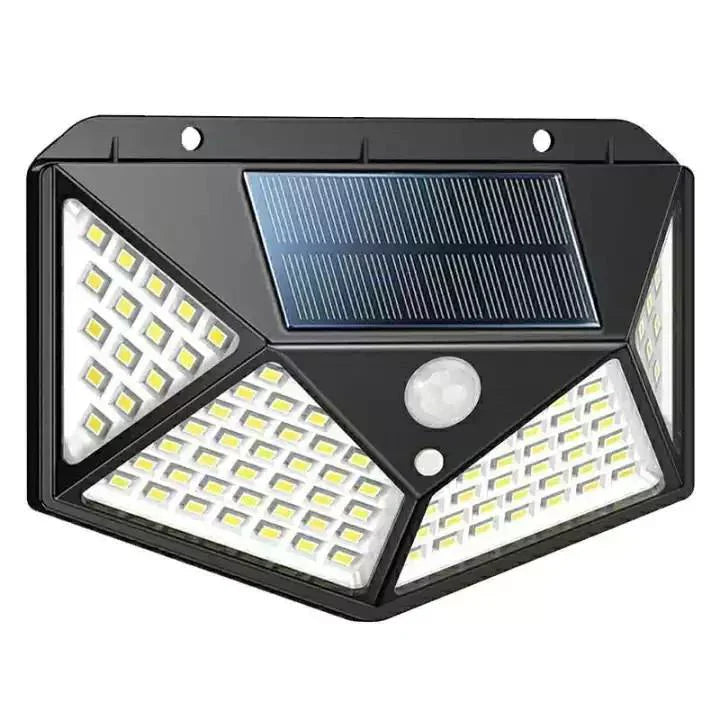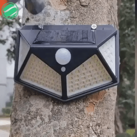 Lámpara solar de 100 leds distribuidos en frotis y laterales del producto para mejorar el ángulo de iluminación. Material del cuerpo ligero: PC + ABS Especificaciones del panel solar: Silicio monocristalino de 5.5V. Especificación de la batería: batería de litio 18650 3.7V 1800MAH con protección de carga y descarga.