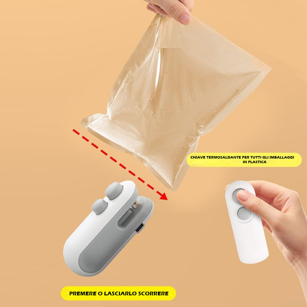 Con el Mini Sellador Portátil, despídete del problema de las bolsas abiertas que dejan entrar aire. Ahora podrás sellar tus alimentos de manera rápida y segura, manteniéndolos frescos y libres de humedad por más tiempo.