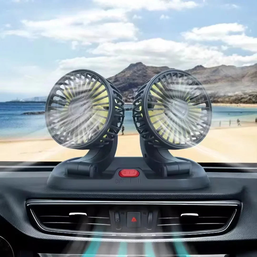 Este Ventilador con doble cabezal para auto te mantiene fresco todo el tiempo con bajo consumo y se adapta a todo tipo de autos, pequeños, medianos, grandes, y vehículos todoterreno.